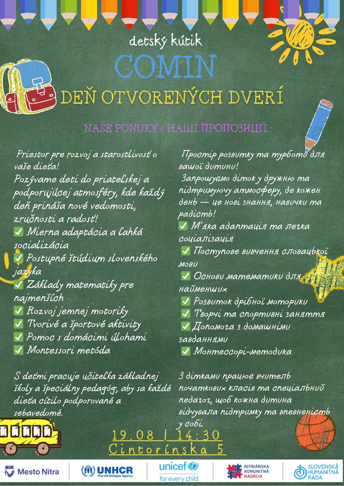 👩🏫 U nás deti zažijú priateľskú atmosféru, tvorivé a športové aktivity, rozvoj jazykových i motorických zručností a Montessori prístup k vzdelávaniu.